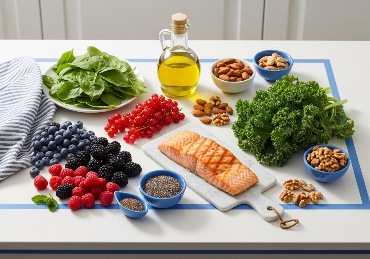 - 2. 항염증 및 항산화 식단: 베리류, 녹색 채소, 견과류, 등푸른 생선 등 슈퍼푸드 적극 활용.