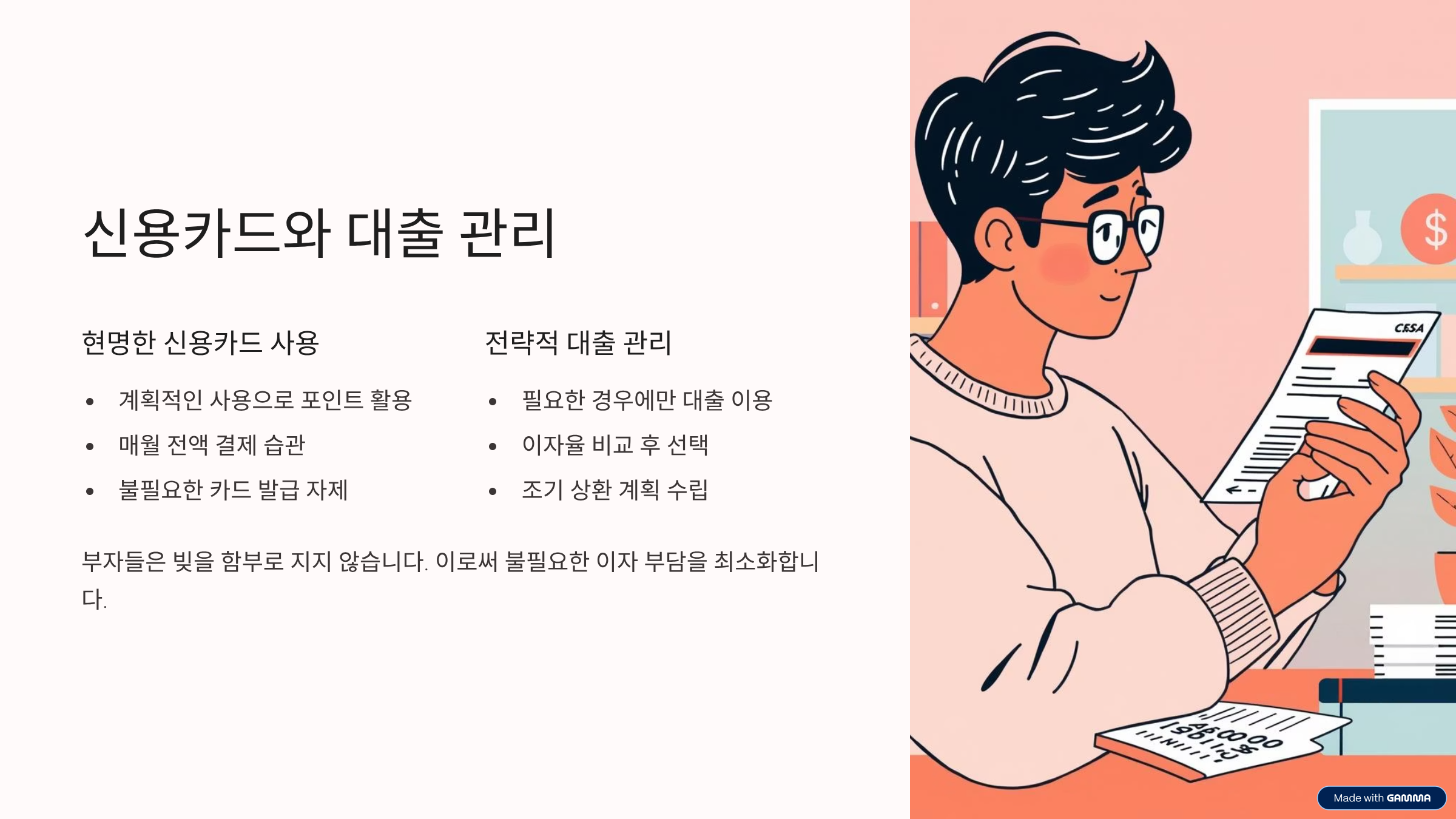 부자들은 빚을 무조건 회피하는 것이 아니라, 빚의 '질'을 이해하고 전략적으로 활용합니다. 신용카드는 무분별하게 사용하지 않고, 계획적인 소비와 신용 점수 관리 도구로 활용합니다. 대출 또한 단순히 소비를 위한 '나쁜 빚'이 아니라, 자산을 늘리거나 생산적인 활동에 투자하는 '좋은 빚'인 경우에만 신중하게 활용합니다. 예를 들어, 저금리 주택담보대출이나 사업 자금 대출 등은 재산을 불리는 데 도움이 될 수 있습니다. 반면, 높은 이자의 카드론이나 고금리 대출은 철저히 지양하여 불필요한 이자 부담을 최소화하고 건전한 재정 상태를 유지합니다.