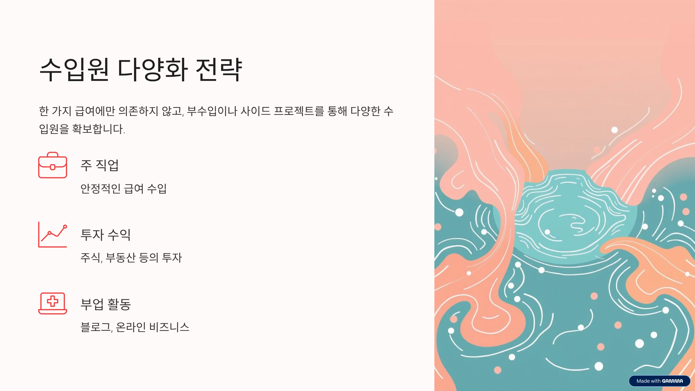 하나의 급여에만 의존하는 것은 현대 사회에서 불안정한 재정 구조를 초래할 수 있습니다. 부자들은 '파이프라인 구축'이라는 개념을 통해 부수입이나 사이드 프로젝트를 적극적으로 모색하여 수입원을 다양화합니다. 이는 단순히 아르바이트를 넘어, 블로그 운영, 온라인 비즈니스, 투자 수익, 부동산 임대 수익, 저작권료 등 다양한 형태의 패시브 인컴(Passive Income) 창출에 주력합니다. 여러 수입원을 확보하는 것은 특정 수입원이 줄어들거나 중단될 위험에 대비하여 재정적 안정성을 높이고, 궁극적으로 경제적 자유에 도달하는 시간을 단축시키는 효과를 가져옵니다.