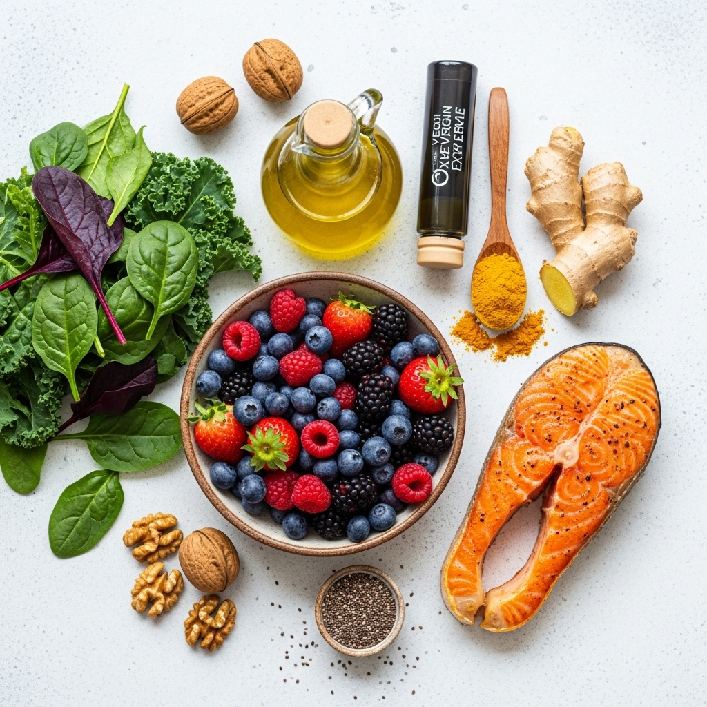 - 섭취 권장 식품: 베리류, 잎채소(시금치, 케일), 올리브 오일, 등푸른생선(고등어, 연어), 견과류, 씨앗류, 강황, 생강 등. 이들은 항산화 성분과 오메가-3 지방산이 풍부하여 염증을 줄이는 데 도움을 줍니다.